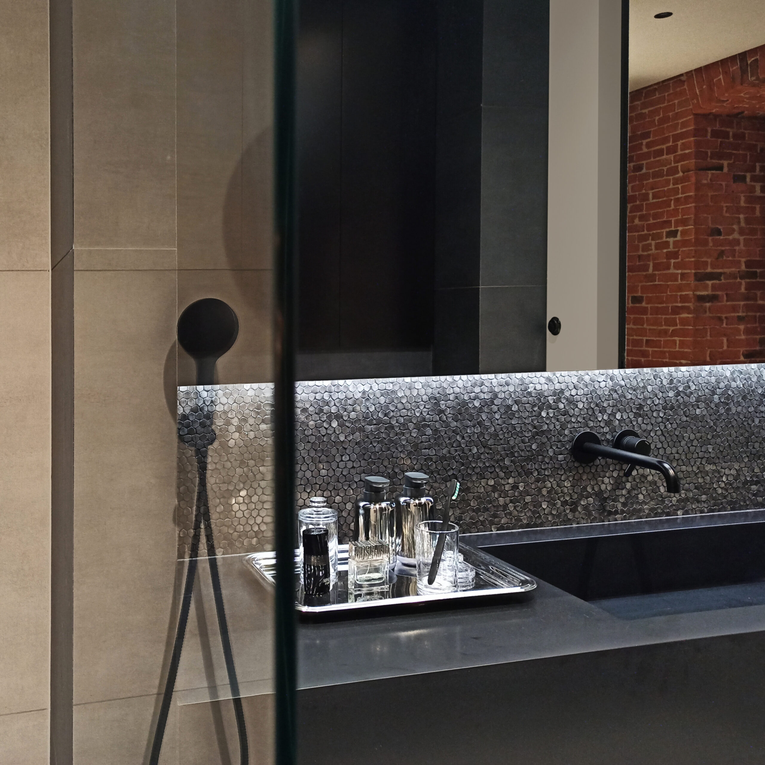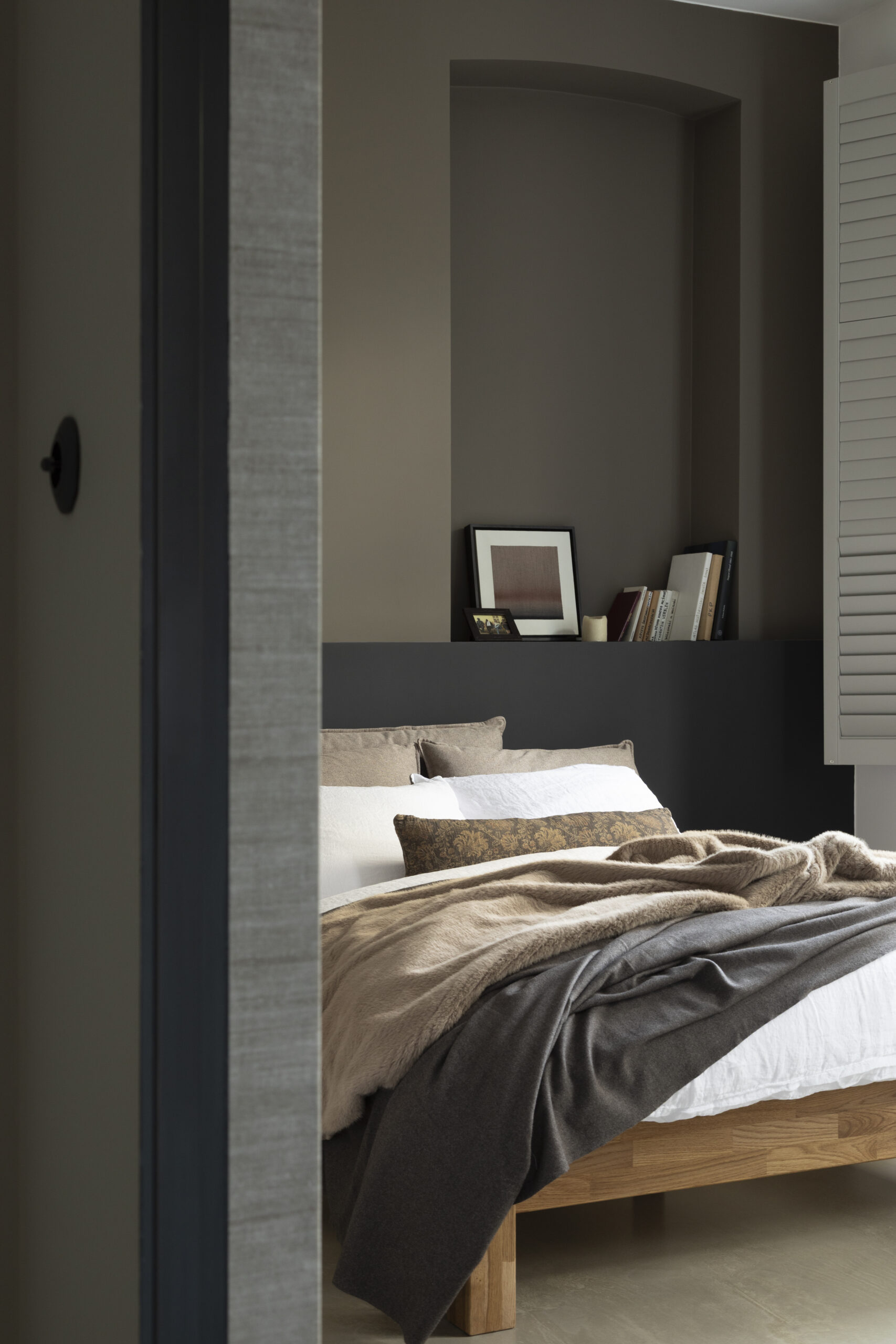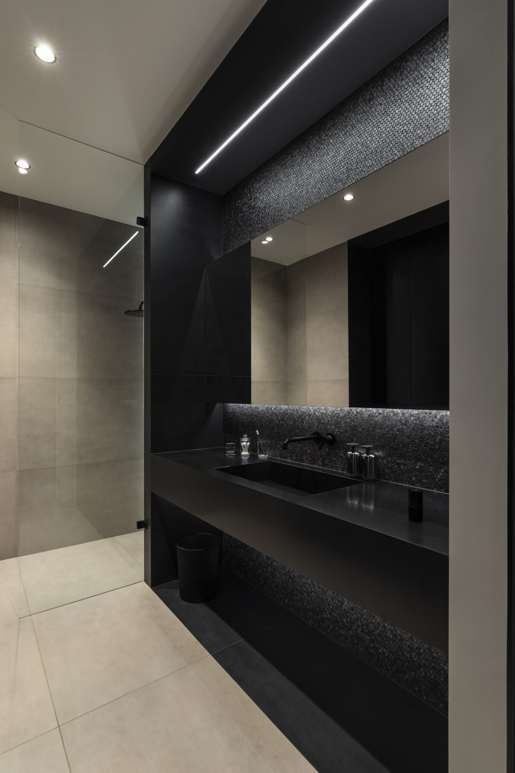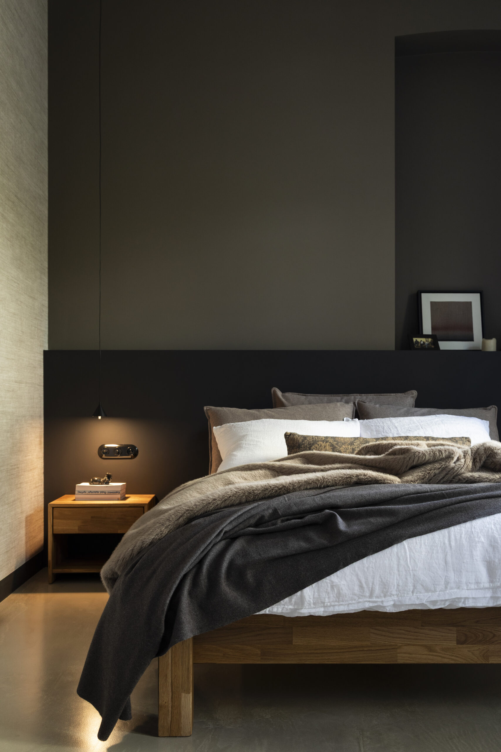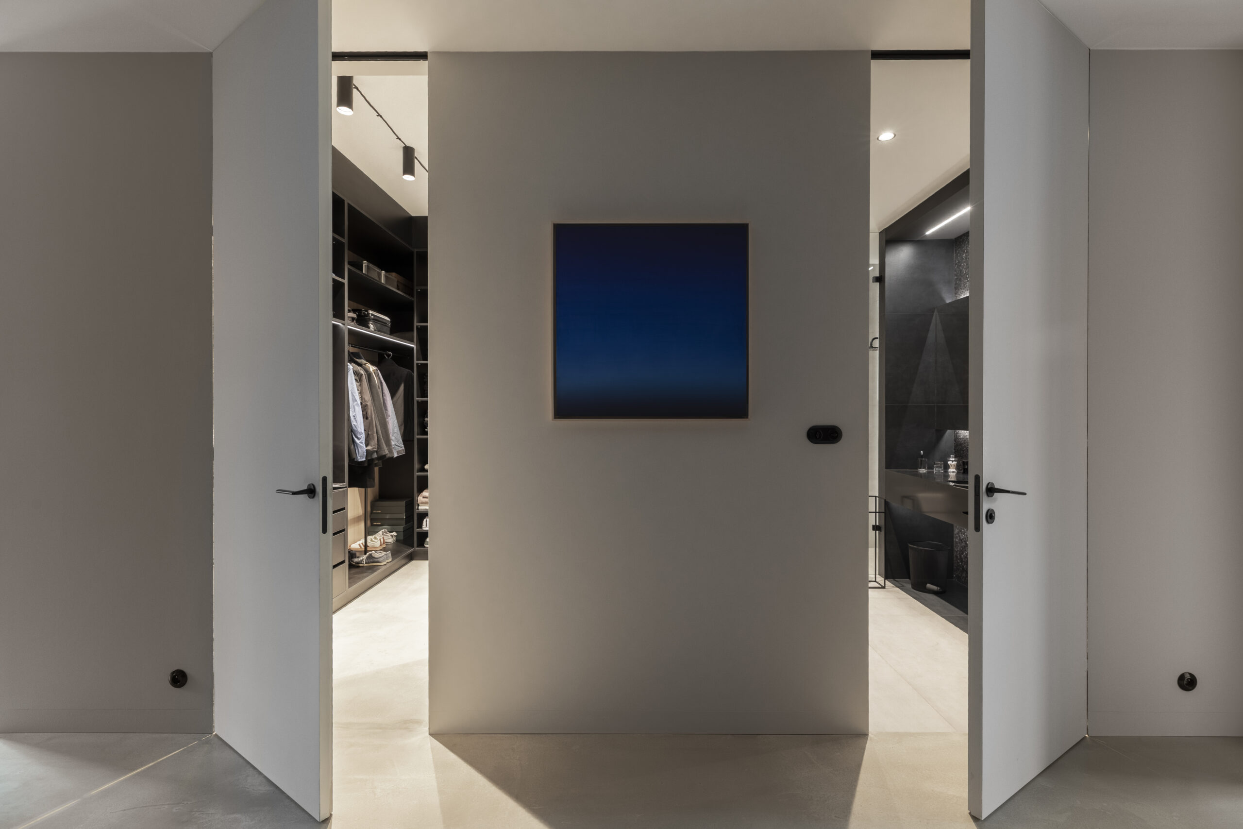tapetami oraz antracytowym wykończeniem mebli. Całość ujęta jest w wąskiej gamie kolorystycznej i minimalistycznych formach,