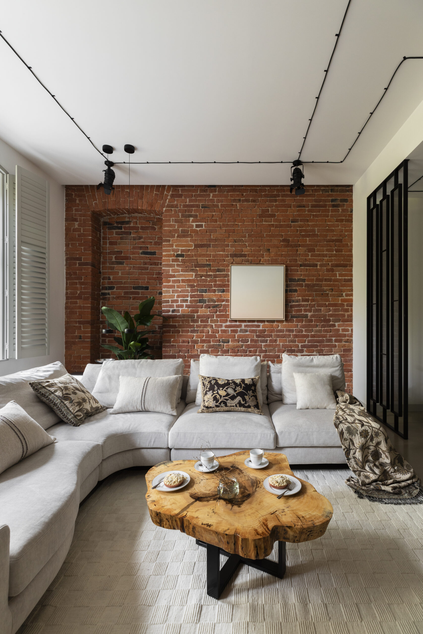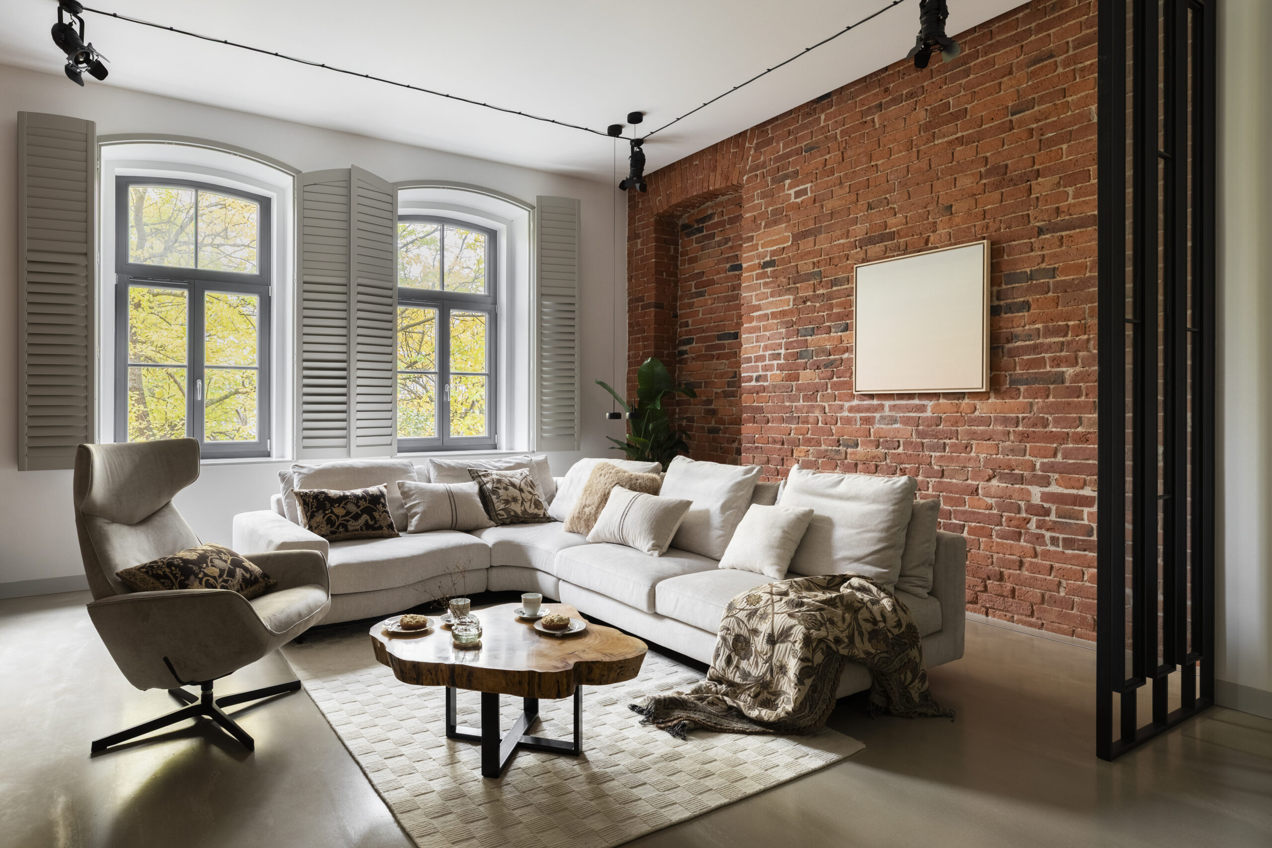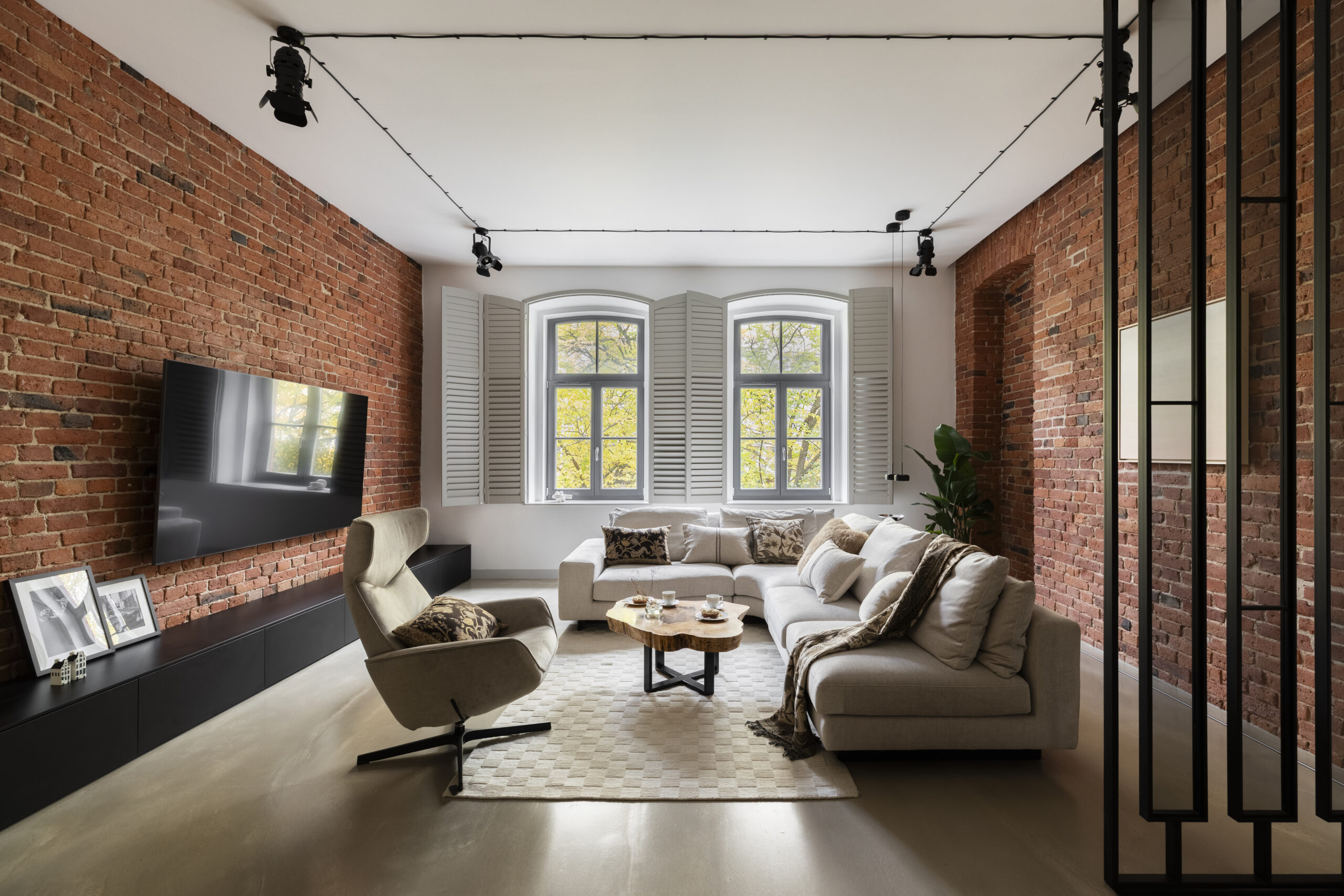 Miejscowe ekspozycje oryginalnego budulca - czerwonej cegły skontrastowane i podkreślone są tkaninowymi